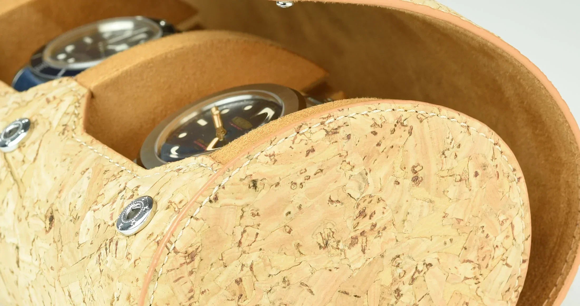 Ce rouleau de montre en liège végétalien fait à la main est conçu pour ranger, exposer et protéger vos montres. Il est fabriqué en liège biologique respectueux de l'environnement et doublé d'un intérieur en microfibre douce. Son design innovant comprend des coussins compressibles qui peuvent accueillir des montres de différentes tailles, des bracelets et des courroies. Chaque montre dispose de son propre compartiment amovible qui flotte à l'intérieur du rouleau et glisse dans et hors de notre système de rails unique, protégeant ainsi entièrement votre montre contre les dommages. Le fond plat du rouleau garantit un placement sûr sur les surfaces dures.