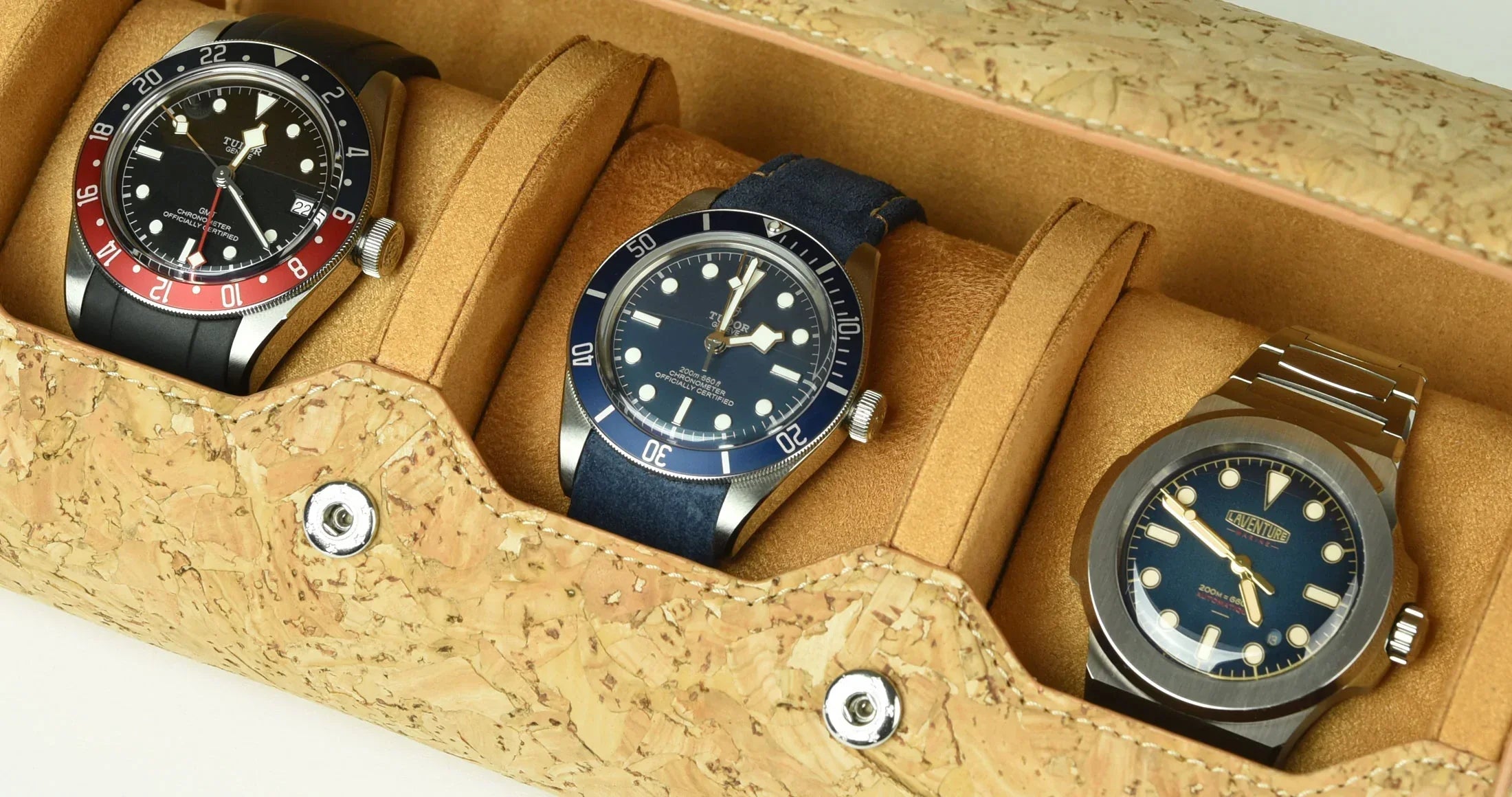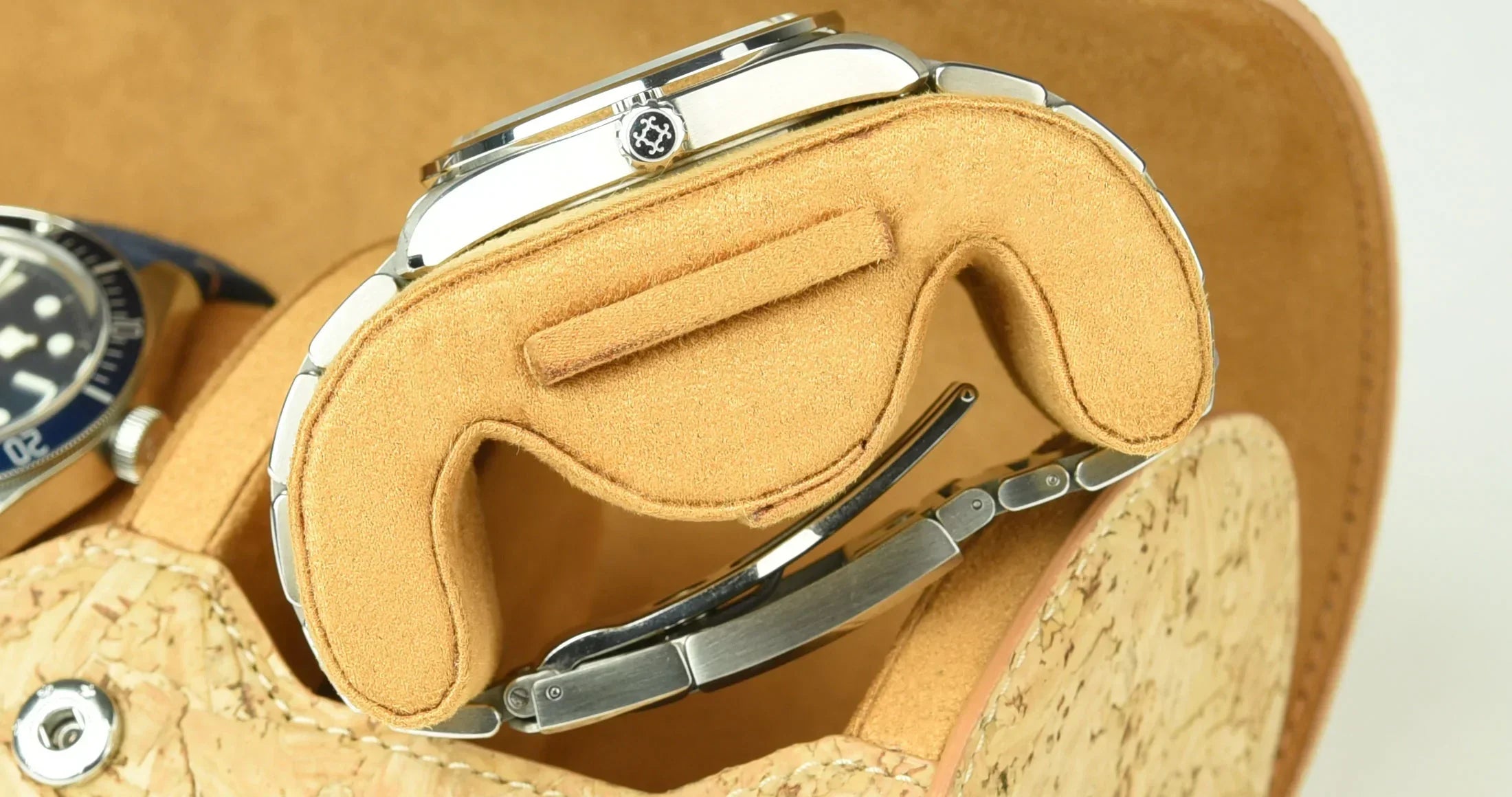 Chaque rouleau de montre est fabriqué à la main de manière experte en utilisant du liège biologique respectueux de l'environnement et d'origine naturelle. Les coutures faites à la main et les bords peints à la française autour du rouleau sont un gage de qualité et de précision, tandis que le matériau unique ne manquera pas d'enrichir votre collection de montres. L'intérieur est recouvert d'une microfibre douce. Ce tissu exceptionnellement doux protège le boîtier et le bracelet de votre montre, évitant ainsi les rayures et les dommages. Une fermeture sécurisée à plusieurs boutons-pression assure une sécurité et une protection optimales pendant le stockage ou le voyage.