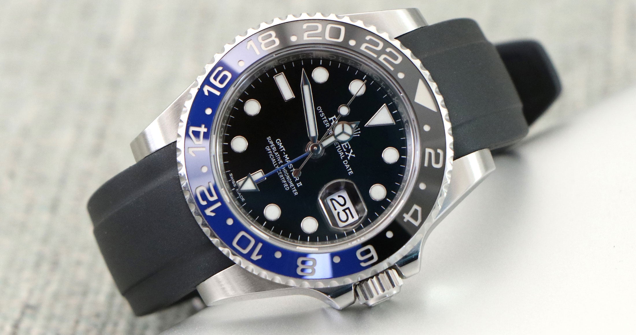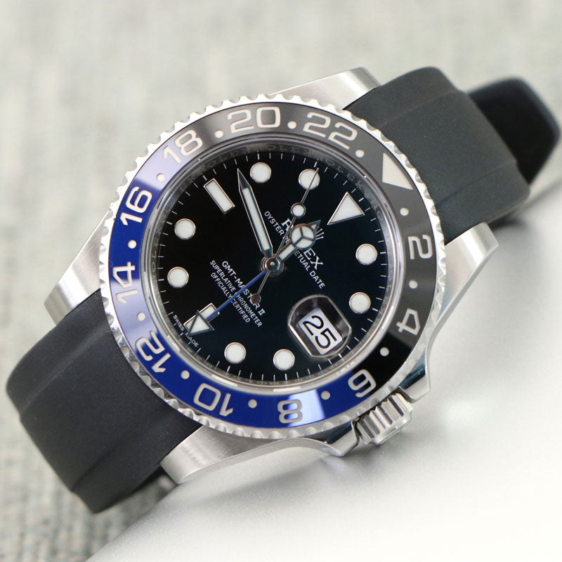 Les bracelets Everest Curved End Rubber sont intentionnellement et méticuleusement conçus pour créer une connexion parfaite entre le boîtier et votre Rolex GMT Ceramic. Le bracelet en caoutchouc à extrémité incurvée, facile à installer, est équipé de barrettes à ressort de qualité Rolex. Au point de connexion, il y a un insert en plastique durci. Cela permet de renforcer la connexion avec le boîtier.